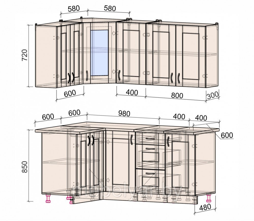 Помимо предлагаемых нами готовых решений можно создать кухню помодульно выбирая из стандартных модулей.